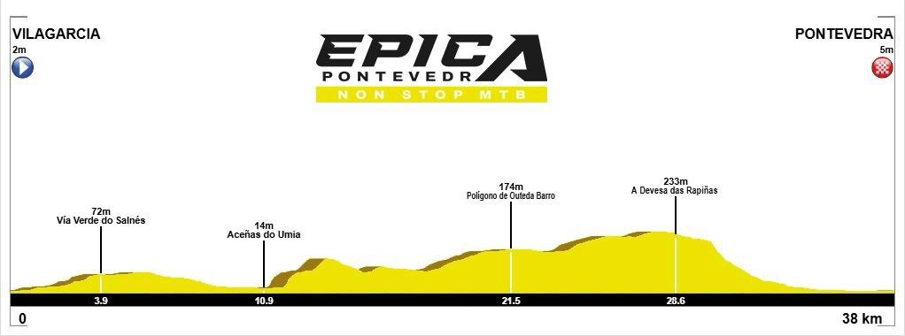 Arrancamos bordeando el mar de Arousa, para cruzar sendas escondidas y cruzaremos el Valle del río Umia entre pistas hacia Lantaño y Portas, para entrar en una zona de enlace que nos acerca a Curro, donde haremos el último ascenso de la prueba y así poder disfrutar de un rápido faldeo del Castrove y una bajada espectacular que antes de entrar a Pontevedra. La tienes. La Épica 100K es tuya.